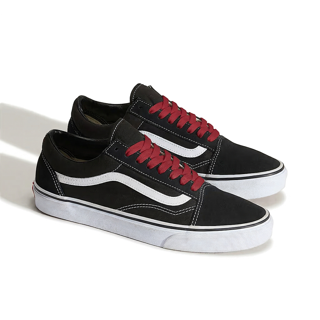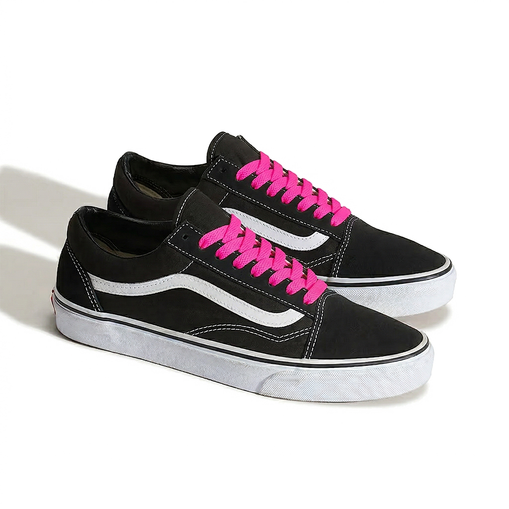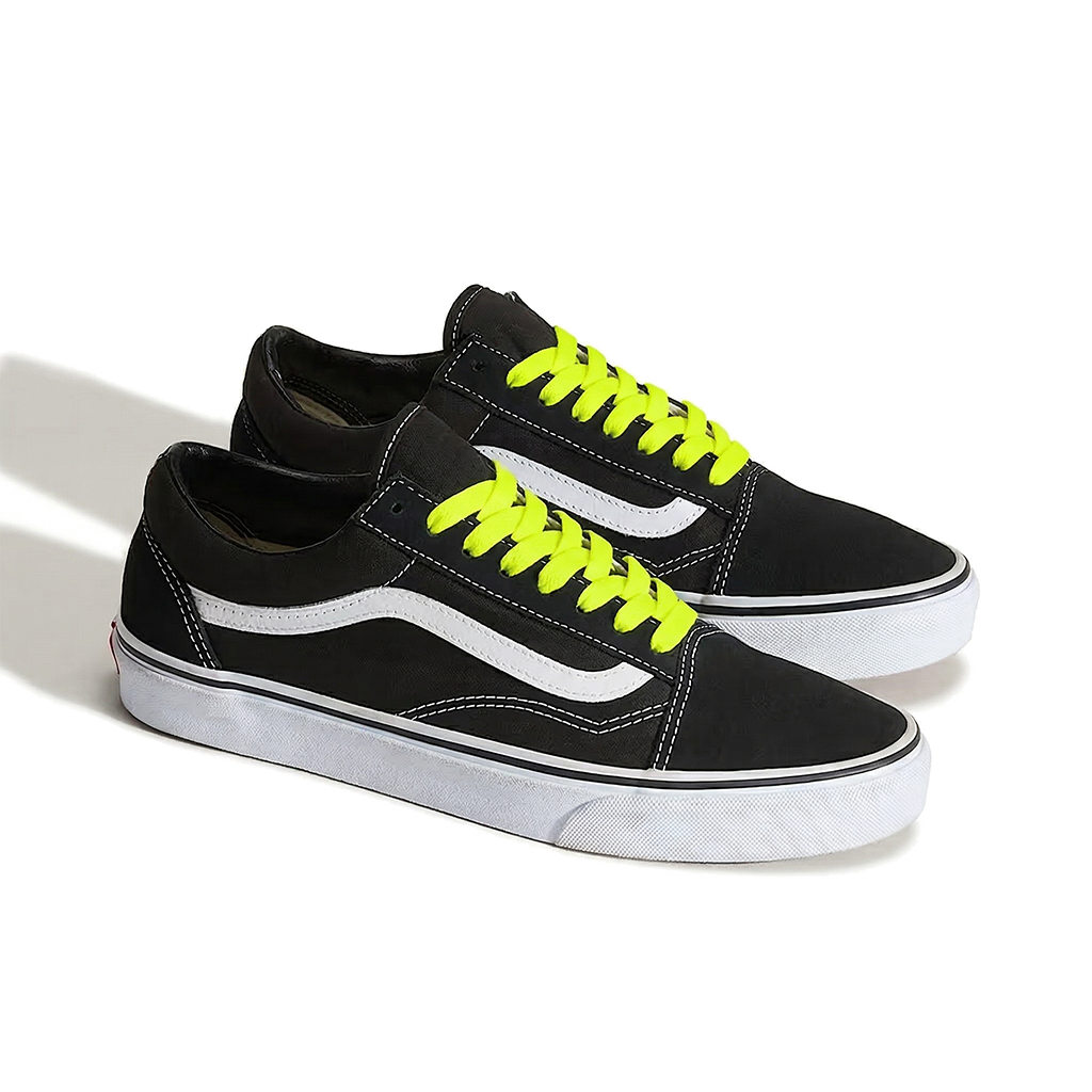 La Old Skool noir/blanc est la version la plus customisée de la gamme. Sur ce coloris, trois directions fonctionnent particulièrement bien : le blanc pur pour un look épuré et contrasté, le rouge vif pour un accent de couleur punk très cohérent avec l'histoire de la chaussure, ou le jaune néon pour un effet streetwear contemporain. Sur les coloris full suède (marine, bordeaux, olive), un lacet ton sur ton de la couleur principale donne un rendu particulièrement soigné et intentionnel.